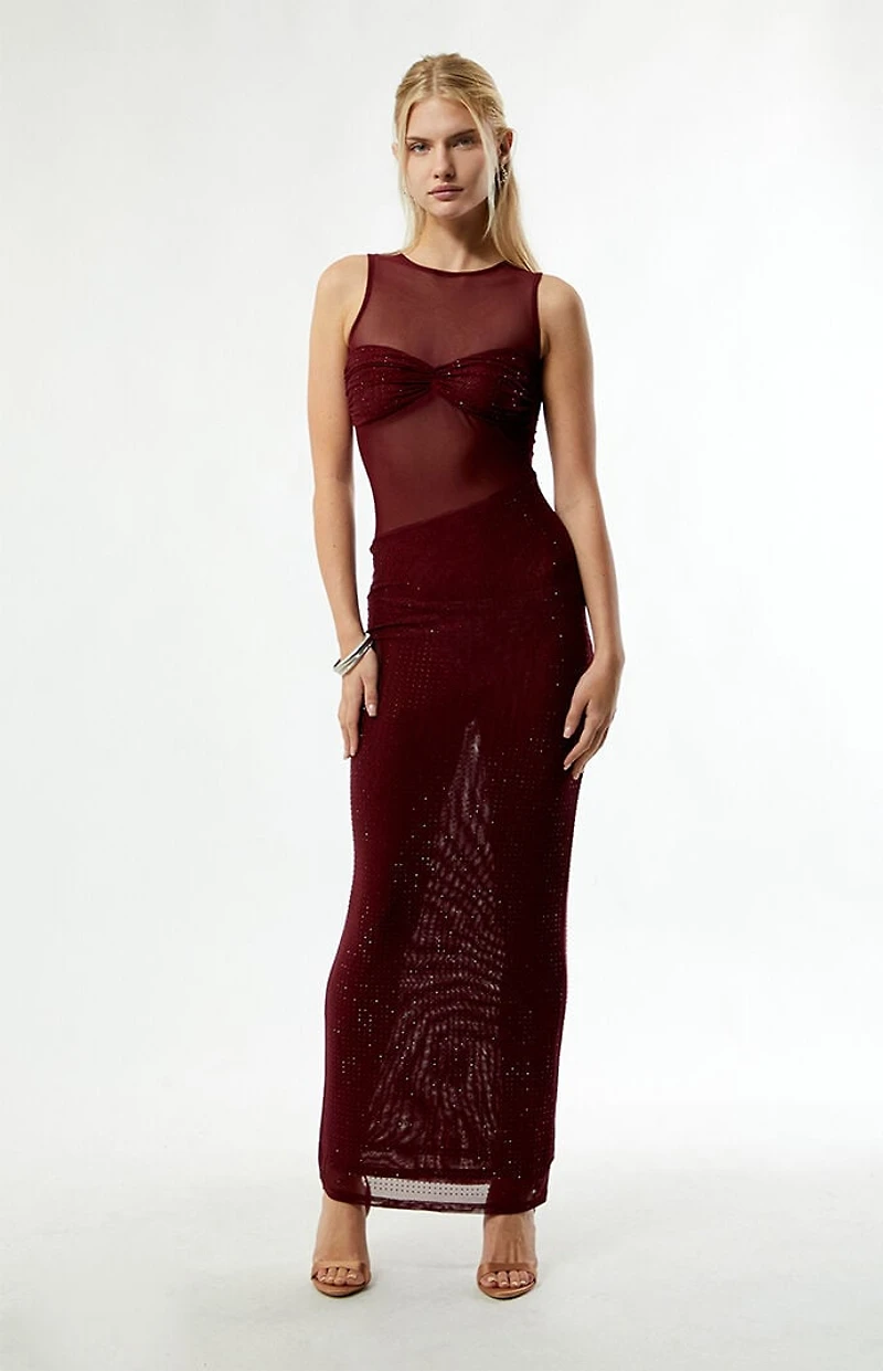 The Tracey Maxi Dress from The Frolic brings sparkling, head-turning style to your wardrobe. Made from semi-sheer mesh fabric, it features allover rhinestone details, a crew neckline, wide fixed straps, and a bodycon fit for a sleek, glamorous silhouette.