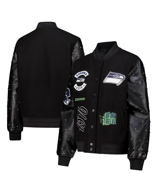 The Wild Collective Women's Black Seattle Seahawks Varsity Full-Snap Sparkle Jacket