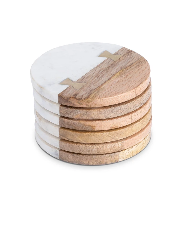 Thirstystone Uptown Round Marble and Wood Coasters with Inlay, Set of 6