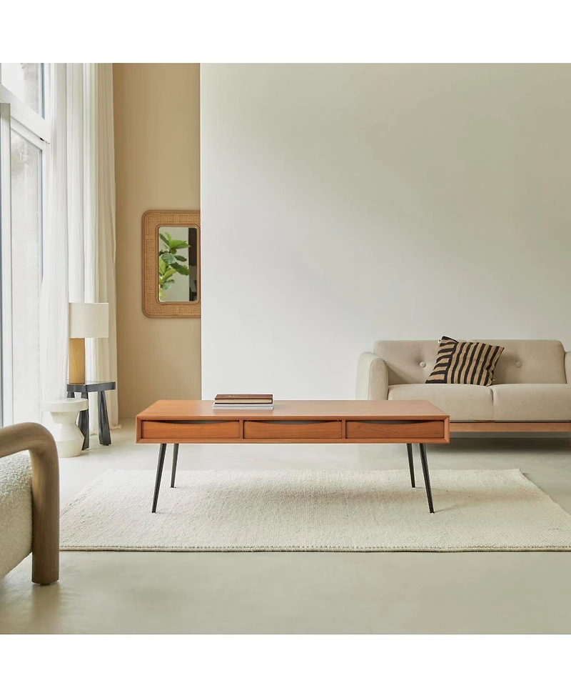 The Simen collection mahogany coffee table from Tikamoon!Our functional table is equipped with three spacious drawers in which you can store your magazines and small hi-fi accessories.It is distinguished by its retro Scandinavian style: straight lines and oblique metal legs. You'll love its mahogany design, which gives the table its authentic character. 3 drawers (H 6 x W 39 x D 57 cm) – solid mahogany drawers, detachable metal legs (H 32 cm – to be screwed onto the base designed for this purpose). Technical details:Material: mahoganyDimensions: H 44 x W 135 x D 65 cmWeight: 20 kg