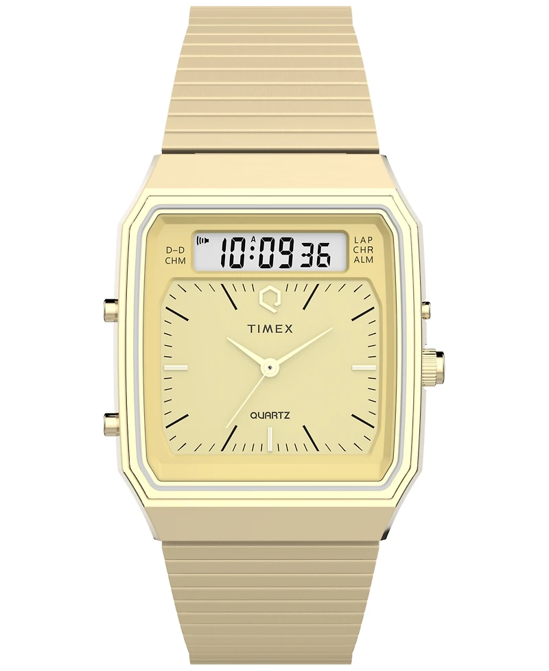 This modern-day reissue of an '80s classic delivers quartz accuracy with a dual analog and digital display on a champagne dial. Upgraded with a modestly sized 33mm brushed and polished stainless-steel case, it's packed with the features you need to keep you on schedule and get you through the work week: dual time zone tracking, chronograph, alarm, and date function. Finished with a thin handset, a polished crown and pushers, a brushed gold-tone stainless-steel bracelet, and the distinct Q Timex logo authentic to the original, this analog-digital dress watch is a true throwback.