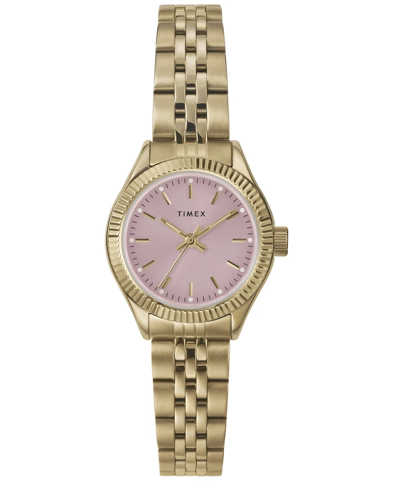Following recent trends in petite watches, we've refined our Women's Timex Legacy with a smaller polished 25mm case. The sunray dial appears in a delicate shade of pink, highlighted by applied indices and perfectly encircled by an elegantly fluted bezel. We've paired this stylish mini with a shining brushed and polished gold-tone stainless-steel bracelet.