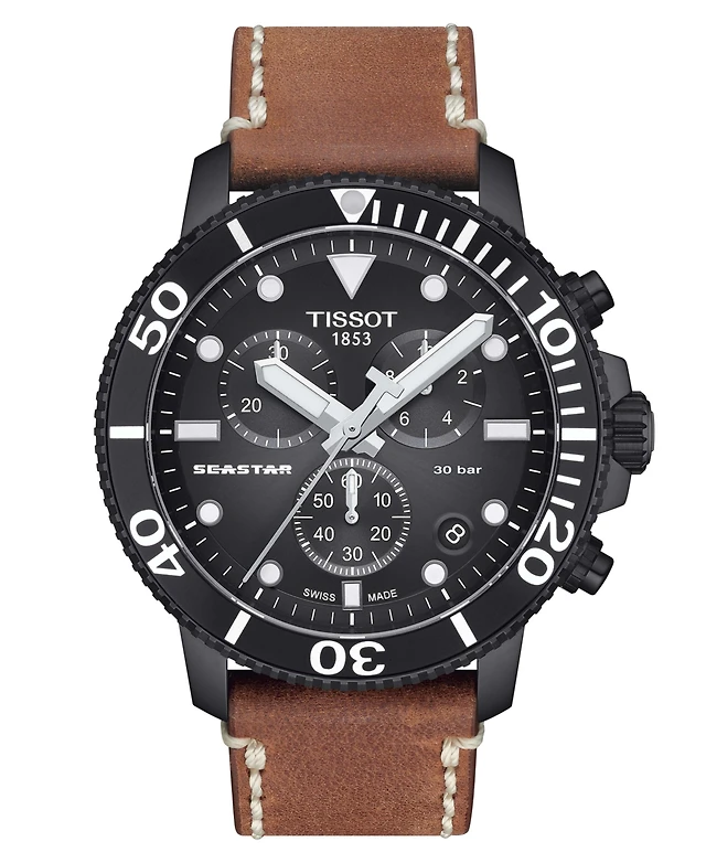 Tissot Men's Swiss Chronograph Seastar Brown Leather Strap Watch 46mm