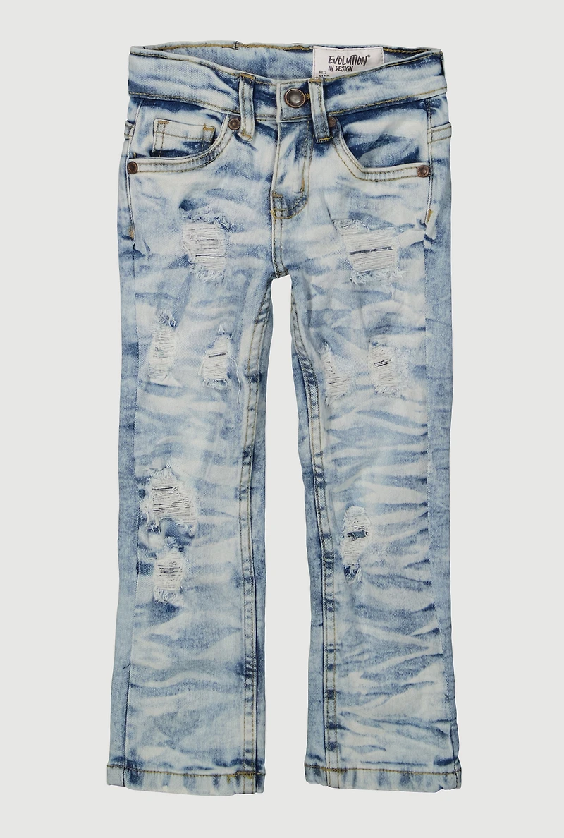 Let your little guy step out in style with these toddler boys whiskered adjustable waistband acid wash distressed jeans. Designed for comfort and cool vibes, these jeans feature a trendy acid wash and authentic distressed details that bring streetwear flair to everyday play. The adjustable waistband ensures a perfect fit as he grows, while the slim straight ankle-length cut keeps things modern and easy to pair with his favorite tees and sneakers. Perfect for casual adventures and making a statement without trying too hard. Adjustable waistband for a comfy, growing fit mid rise and slim straight ankle-length leg for a trendy silhouette durable denim with acid wash and distressed whiskering for authentic street style casual and streetwear-ready, perfect for everyday fun designed with patching, frayed accents, and repair details for extra character content and care material: 98% cotton, 2% spandex care instructions: machine wash, tumble dry country of origin: pakistan rainbow item number 3523073150590 light wash - 3523073150590402
