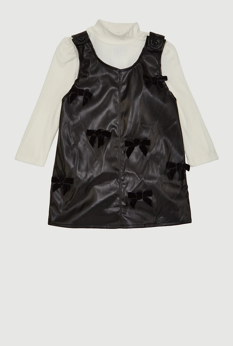Toddler Girls Bow Detail Faux Leather Overall Dress with Top