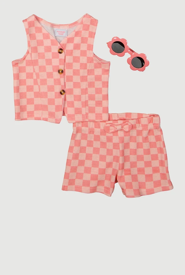 Toddler Girls Checkered Rib Knit Vest and Shorts with Sunglasses