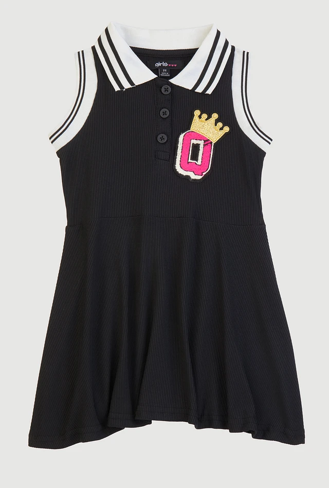Toddler Girls Rib Knit Q Chenille Patch Graphic Skater Dress, Black, Size 4T