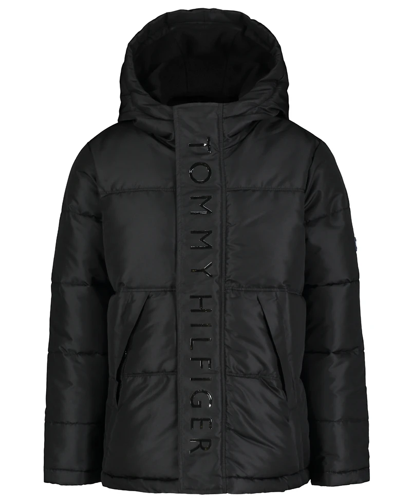 Stay warm in signature Tommy Hilfiger style with this ultra-cozy puffer jacket. Fluffy fleece lining and a hood provide comfort and coverage, while tonal logo graphics conceal the full-zip closure. Two slant pockets keep essentials close, and a rubber flag logo patch adds a premium touch.