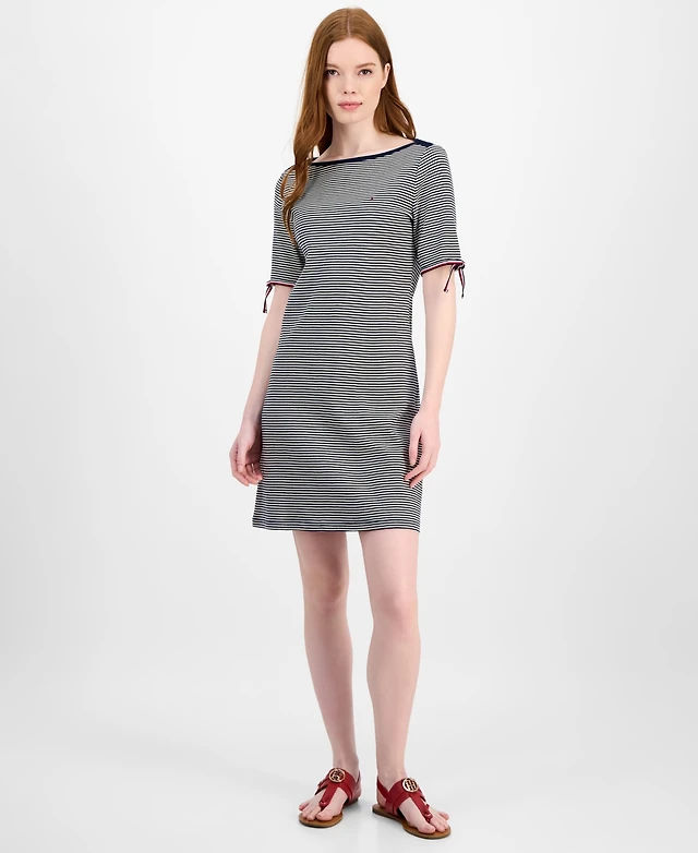 Tommy Hilfiger Women's Striped Cotton Boat-Neck Tie-Sleeve Dress