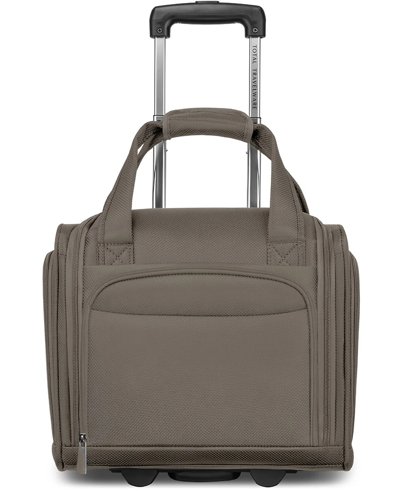 The Total Travelware Charleston 15"" Under seat bag is packed with features and is a perfect wheeled carry-on for a short or long trip. It is carry-on friendly and fits under the seat on most airlines. The poly-ballistic fabric is both luxurious and durable. Featuring multiple pockets, the large main packing compartment is great for clothing, shoes, and accessories. The front zip pocket is ideal for accessories, and the 2 side zipper pockets can be used for any last-minute items. The 3 inside zipper pockets are great for travel essentials and smaller items. The 5-stage aluminum locking push button handle adjusts to your height for comfort and ease. With the add-a-bag strap feature, you can slip over the handle of another rolling item to help make traveling a breeze.