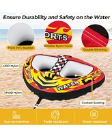 This 2-person towable tube features dual cockpits, padded handles, and a heavy-duty Pvc bladder. Built for lakes, rivers, and oceans, it offers thrilling water fun with quick inflation, towing, and storage.