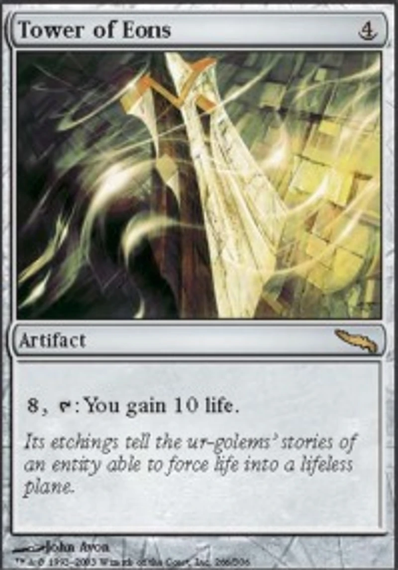 Color: Artifact Card Text: 8 , T You gain 10 life. Rarity: R Cost: 4 Card Type: Artist: John Avon Name: Tower of Eons Finish: Regular Card Number: 266/306 Set Name: Mirrodin