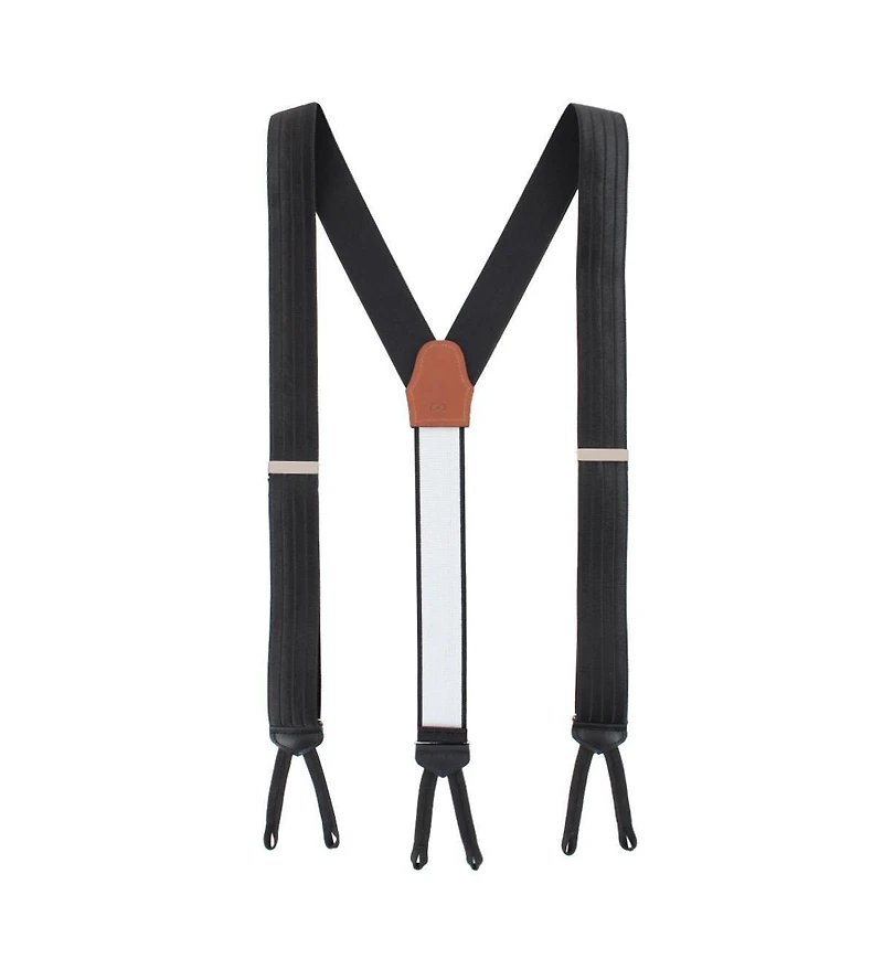 Refined, understated, and effortlessly polished, the Jefferson Brushed Pinstripe Elastic Formal End suspenders are a timeless accessory for elevated formal dressing. Crafted from softly brushed elastic with subtle pinstripe detailing, they bring texture and sophistication to any tailored look while offering comfortable stretch and a secure fit. Finished with sleek metal adjusters and classic formal ends, these suspenders deliver a distinguished alternative to the belt, perfect for sharp suiting, occasion wear, and everyday refinement. Measures 35mm wide and is adjustable from 33 to 48 inches long for a customizable fit..