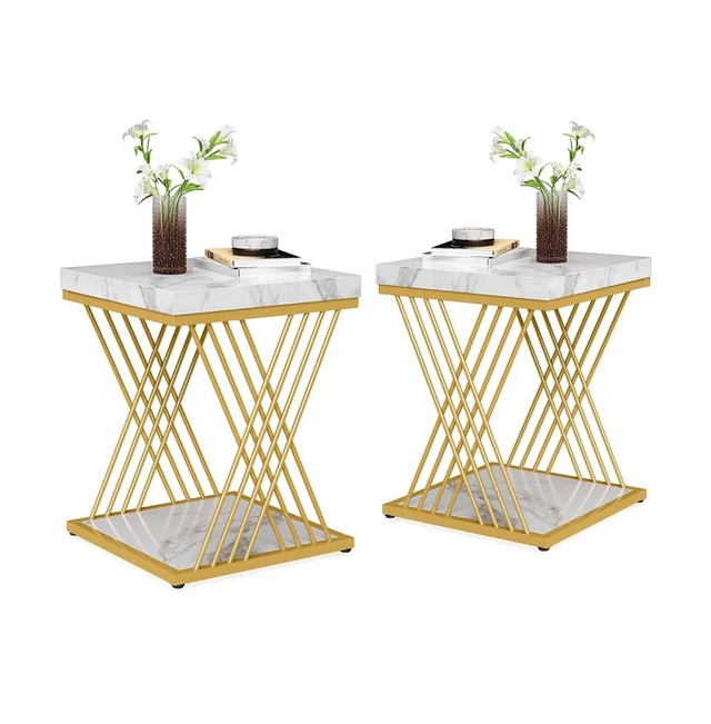Tribesigns Set of 2 Square End Table, White Gold 2-Tier Side Table, Modern Small Bedside Table with Storage for Couch, Sofa Side Table with Stylish Me