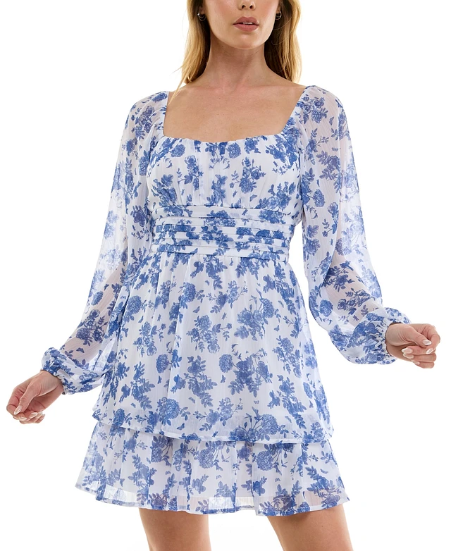 Trixxi Juniors' Floral Print Chiffon Blouson-Sleeve Fit & Flare Dress