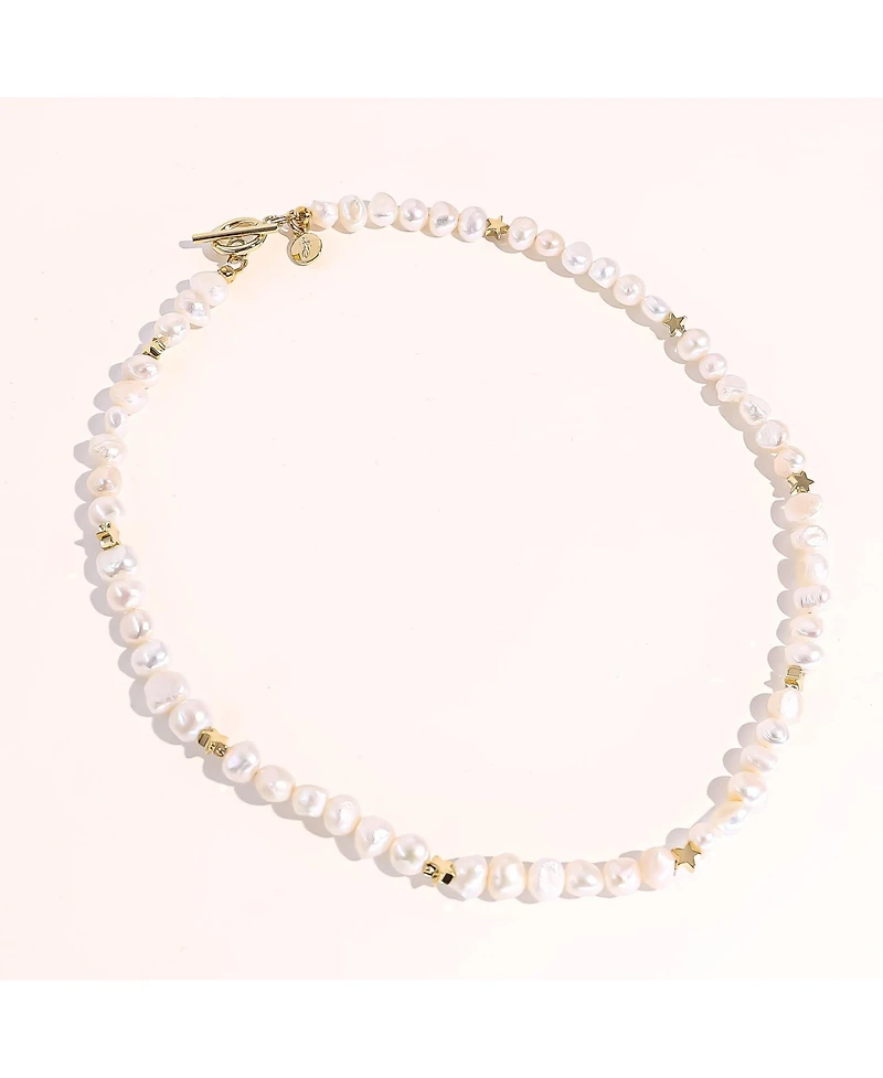 Pearl and star necklace Express your individual style and shine with this star and pearl Twinkie Necklace. Handmade in Manhattan, this necklace is made with 18K gold plated stars and freshwater pearls. This style is very chic and will make you feel like a star. Materials: 18K Gold On Stainless Steel Length: Approx. Small 17” (43.1 cm) Large 19” (48.2 cm) Weight: 30 g Crafted: Usa Pearl: 8-9 mm Baroque Freshwater Pearl Pearl Grade: Baroque Freshwater Pearl Baroque freshwater pearls are distinctive for their irregular shapes and unique textures. Each non-spherical pearl boasts a lustrous surface, reflecting light in a captivating way. These pearls, varying in color and size, are treasured for their natural, unconventional beauty, adding elegance and uniqueness to jewelry.