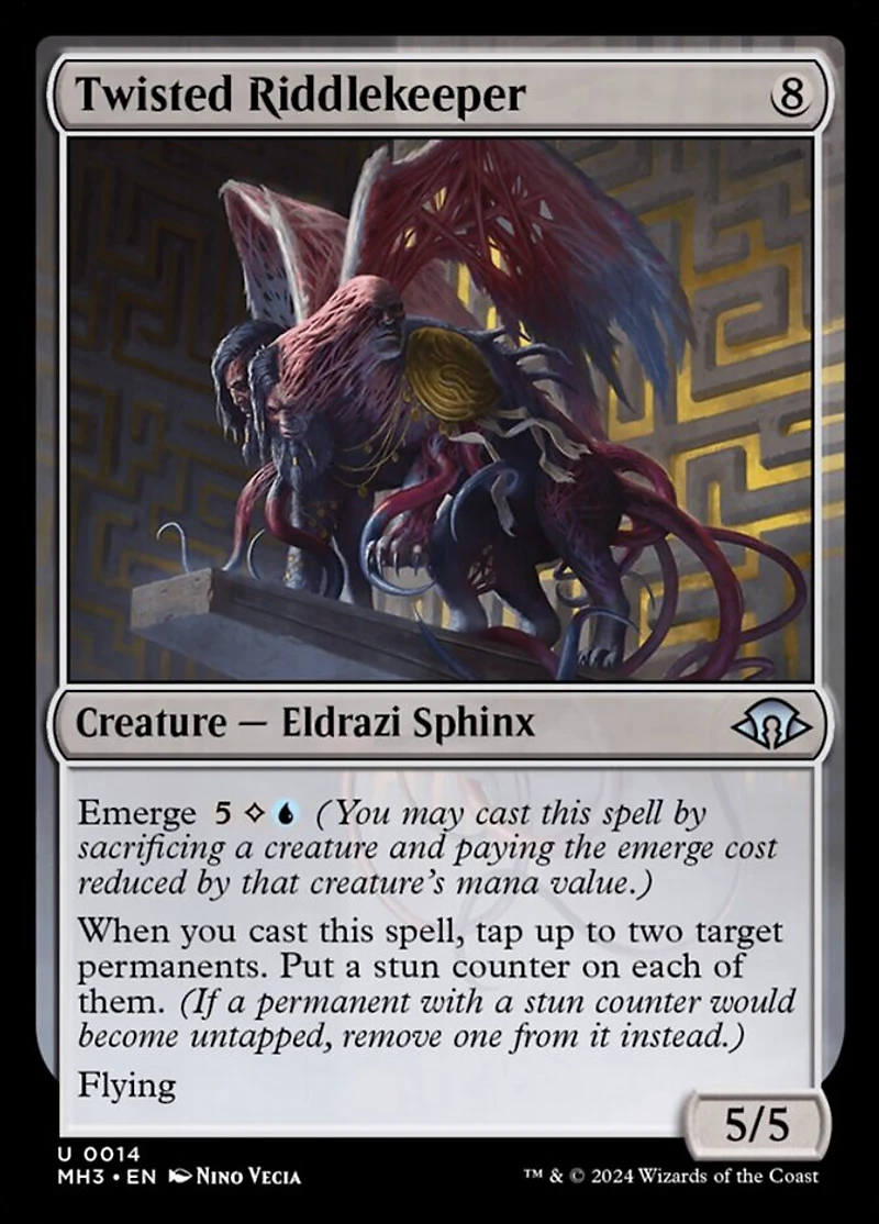 Color: Colorless Rarity: U Cost: 8 Pow/Tgh: 5/5 Card Type: Creature - Eldrazi Sphinx Artist: Nino Vecia Name: Twisted Riddlekeeper Finish: Foil Card Number: 0014 Set Name: Modern Horizons 3