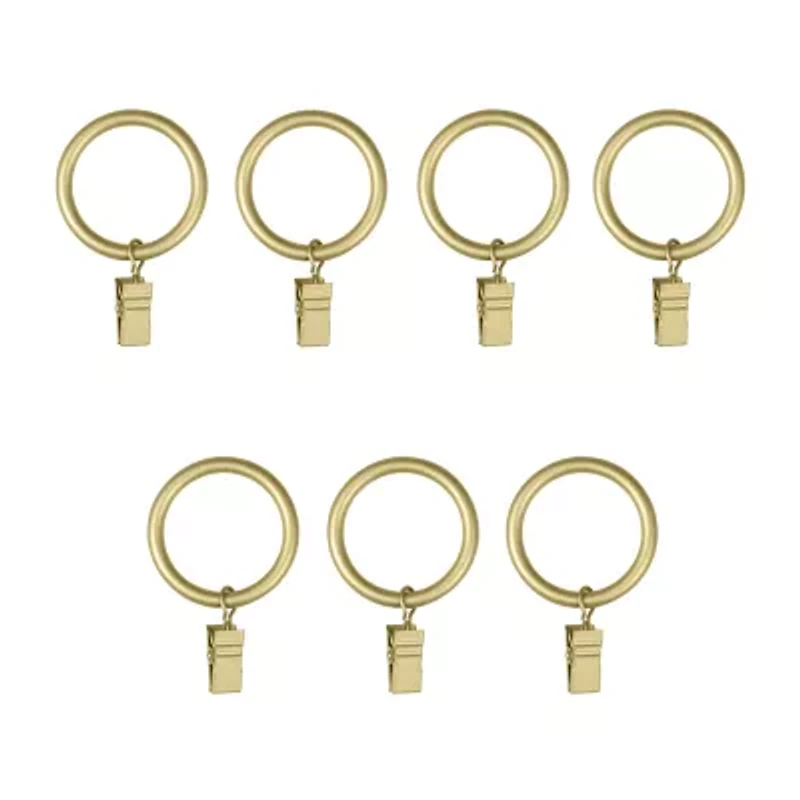 Made of metal with a smooth finish, these curtain rings fit rods 1 inches or less. There are seven rings in a pack, with clips attached. Order these easy-to-use curtain hooks today for a simple drapery solution.