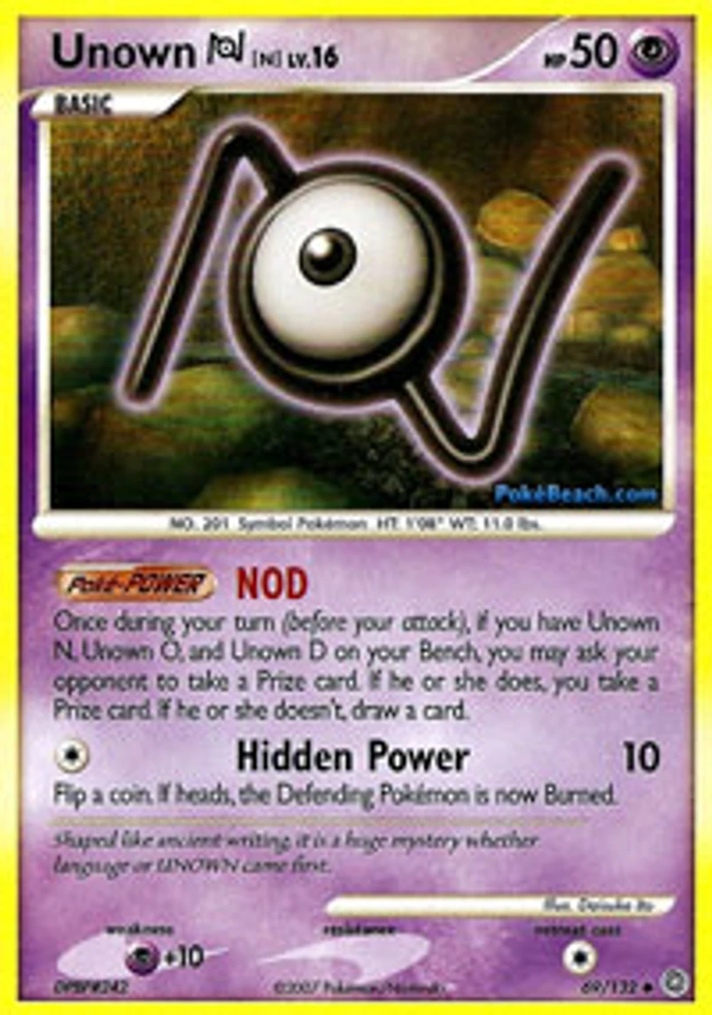 Set: Secret Wonders Card Number: 69/132 Rarity: Uncommon Illustrator: Daisuke Ito Retreat Cost: 1 Weakness: 1 +10 HP: 50 Stage: Basic Card Type: Psychic Name: Unown [N] Finish: Regular Attack #1: 1 Hidden Power (10) Flip a coin. If heads , the Defending Pok Manufacturer: The Pokemon Company