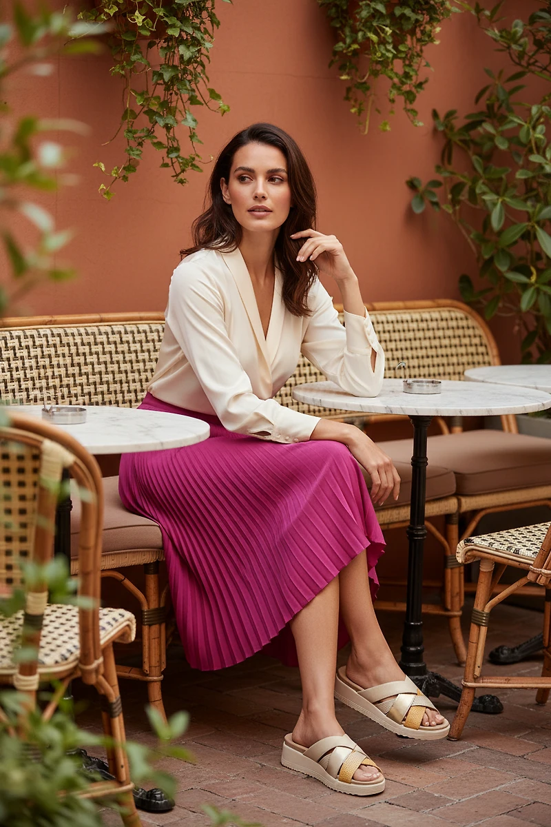 Napa leather platform sandal featuring textured details in almond and light gold tones. Engineered with Sola+Comfort technology, this design absorbs ground impact to reduce foot fatigue and strain. The extra-thick sole provides sustained cushioning throughout the day, keeping your feet supported and comfortable with every step. A sophisticated choice for those who refuse to compromise between style and all-day wearability.