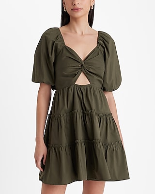 A fit and flare mini dress complete with puff sleeves, a tiered skirt, front cutout, and twist design. The dress is double-lined at the bodice with a smocked back and has hand pockets.