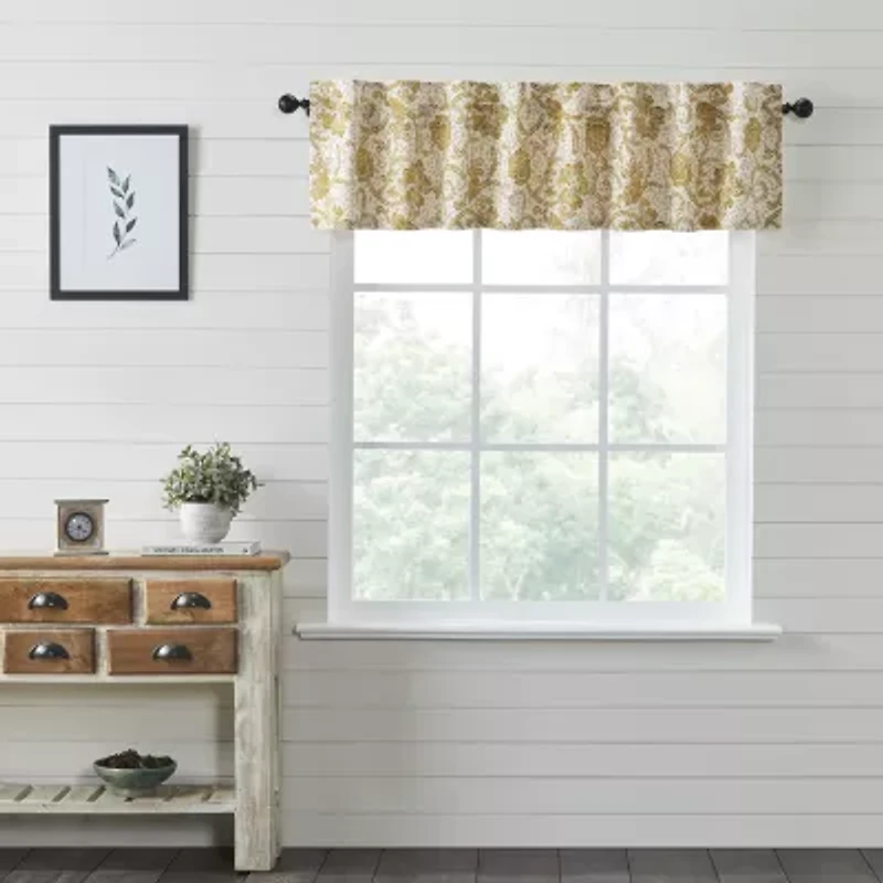 Detailed golden swirls in a floral design weave across an off-white background to create a warm, vintage look. Our Dorset Gold Floral Valance 16x60 is the perfect choice for a variety of decorating styles. From a vintage country kitchen to a cozy cottage living room, this curtain adds charm and interest to any window. A rod pocket is included near the top for easy hanging.