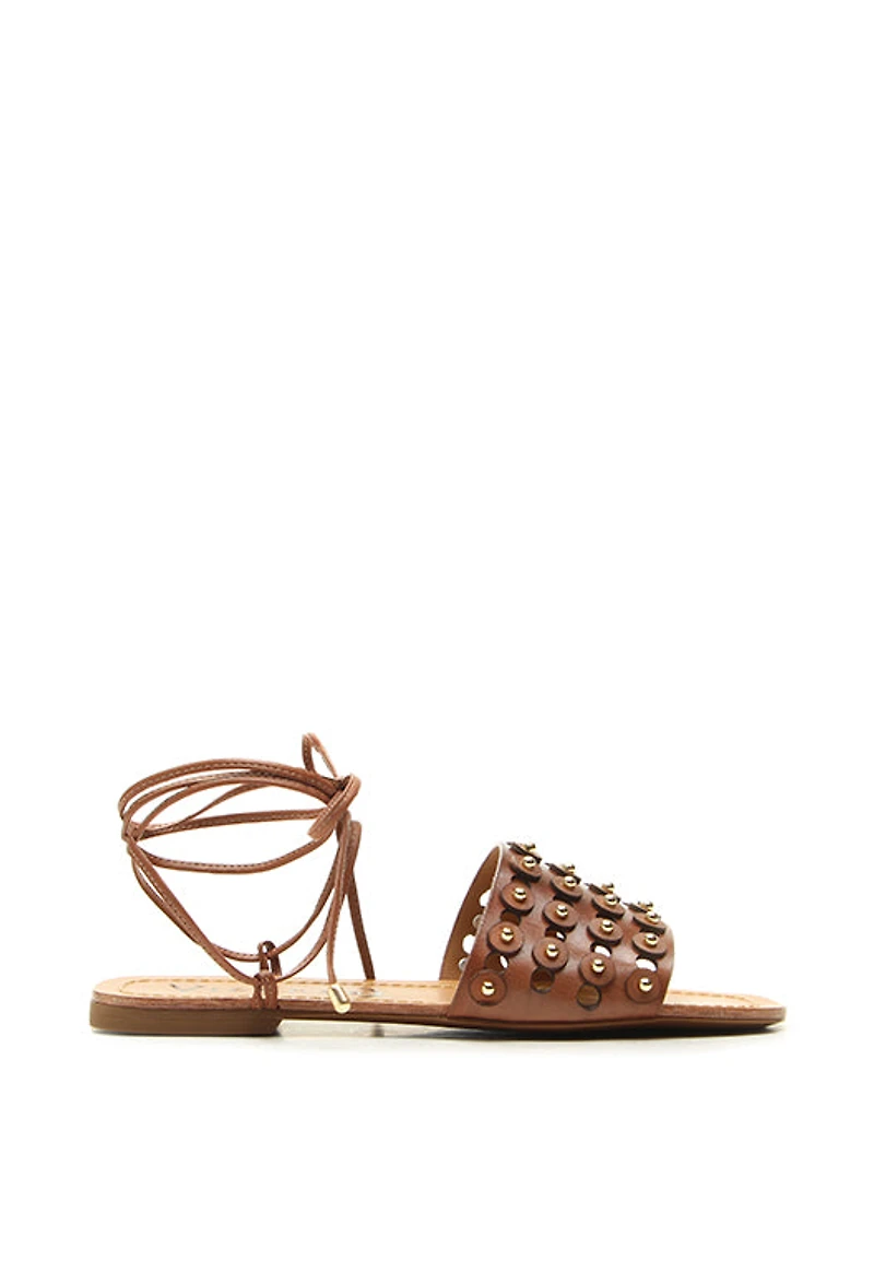 Authentic leather flat sandals, meticulously crafted in Brazil with uncompromising quality standards. This sophisticated design features adjustable leg-tie straps paired with ornamental accents that elevate any ensemble. Genuine leather construction ensures exceptional durability and comfort, while premium finishes reflect meticulous attention to every detail. Ideal for those seeking timeless elegance without sacrificing wearability.