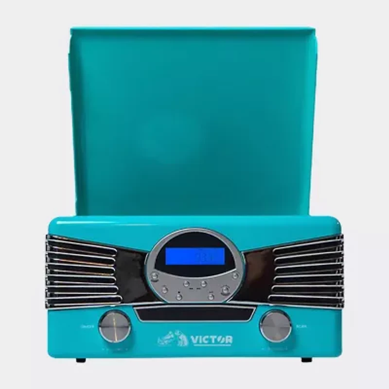 The Victor Beacon VHRP-1400-TQ is known for It's "Diner" as its retro 1950s diner look-brings charm and versatility in one vibrant turquoise package. Plays vinyl records at 33?, 45, or 78 RPM, while extra buttons unlock CD and MP3 playback, AM/FM radio, Bluetooth in/out, and USB options-including digitizing your classic tunes. Dual Bluetooth "In" lets you stream music to the built-in speakers, while "Out" sends your vinyl to wireless speakers or headphones. It also includes a remote control, dust cover, and 45 RPM adapter for a complete nostalgic-yet-modern listening experience.