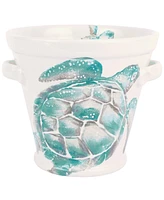 Hand-painted sea turtles in hues of aqua and taupe glide across a clean, white canvas on the Tartaruga Ice Bucket, crafted by maestro artisan Gianluca Fabbro.