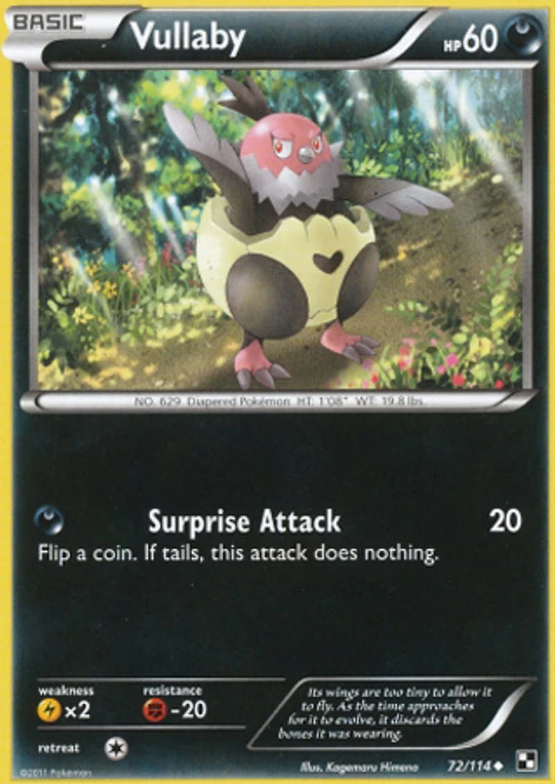Set: Black and White Card Number: 72/114 Rarity: Uncommon Illustrator: Kagemaru Himeno Retreat Cost: 1 Weakness: Lightning HP: 60 Stage: Basic Card Type: Darkness Resistance: Psychic Name: Vullaby Finish: Regular Attack #1: D Surprise Attack (20) Flip a coin. If tails , this attack does nothing. Manufacturer: The Pokemon Company