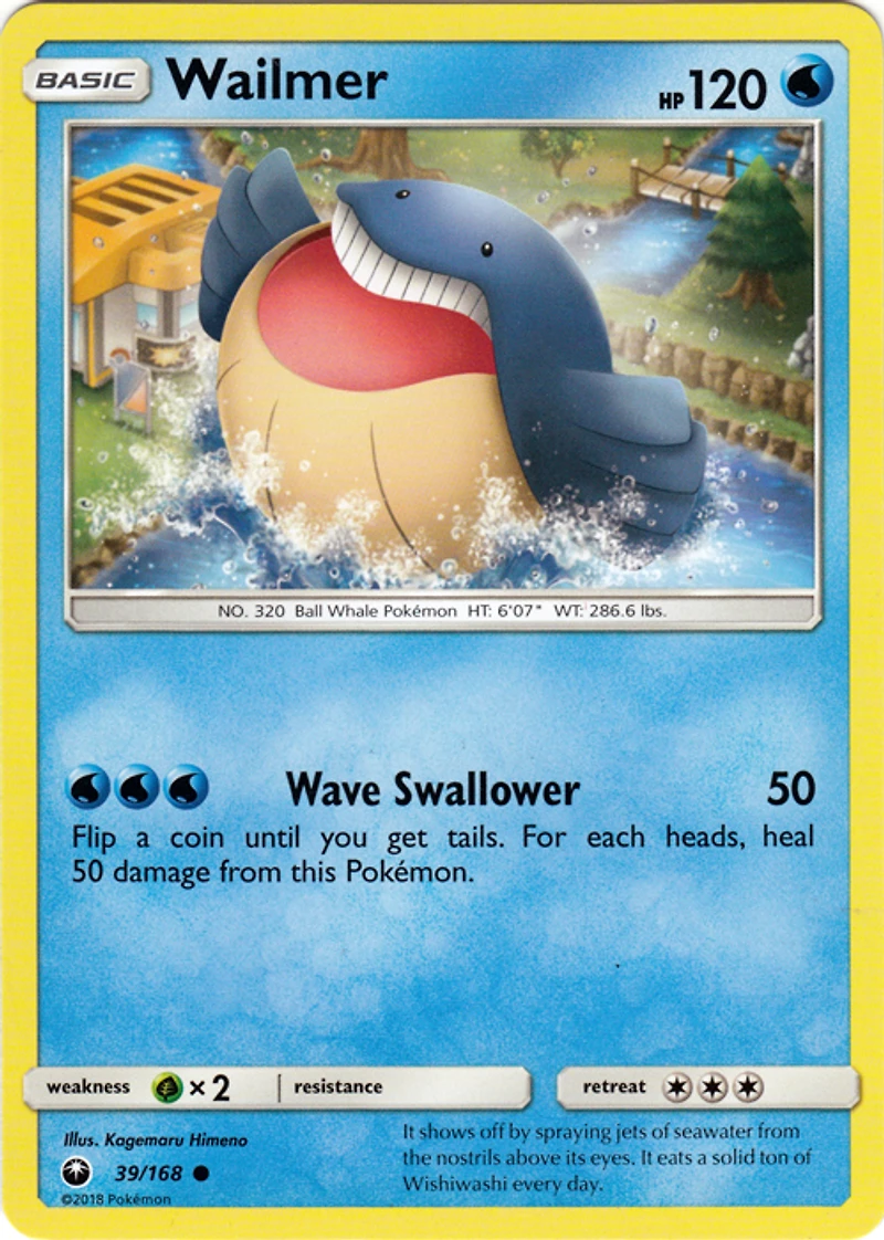 Set: Sun & Moon: Celestial Storm Card Number: 39/168 Rarity: Common Retreat Cost: 3 Weakness: Grass HP: 120 Stage: Basic Card Type: Water Name: Wailmer Finish: Regular Attack #1: [WWW] Swallow Waves: 50 damage. Flip a coin until you get tails. For each heads , heal 50 damage from this Pokemon. Manufacturer: The Pokemon Company