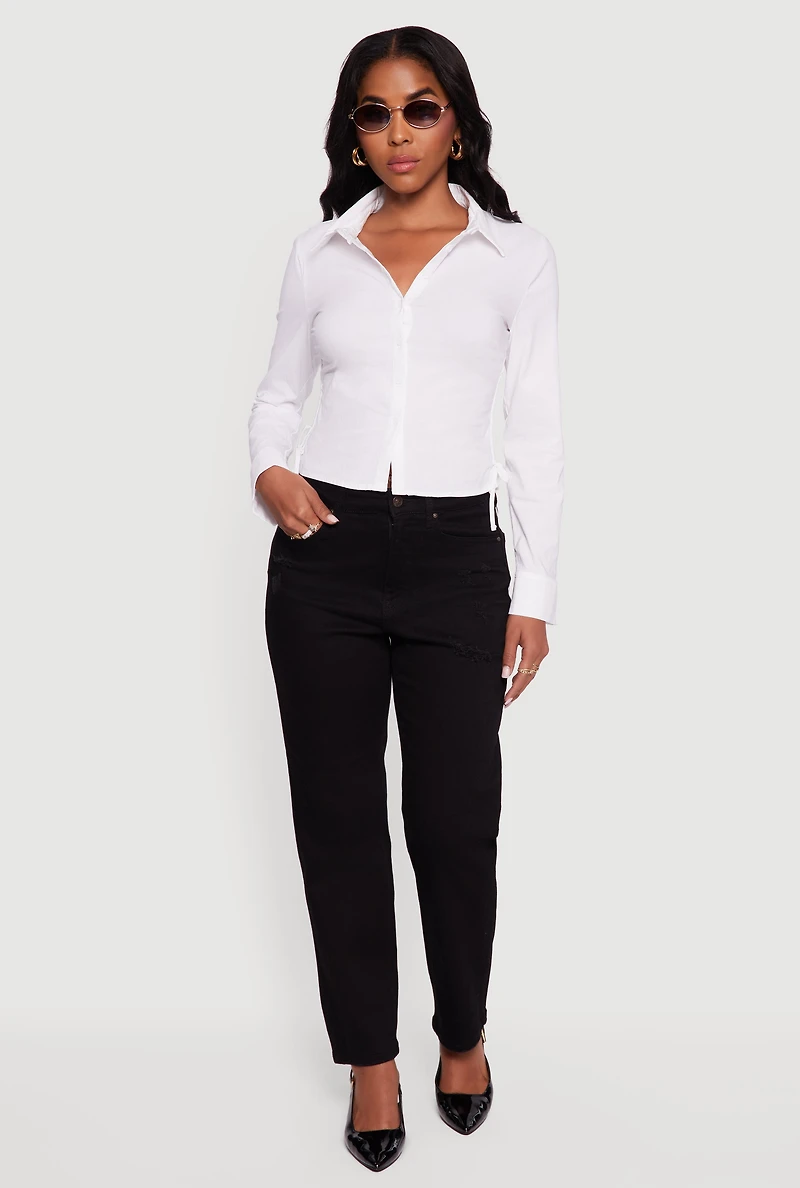 Step into effortless cool with the WAX Distressed Frayed Straight Leg Jeans. These mid-rise denim beauties bring a perfect mix of classic fit and edgy vibes with their distressed and frayed details. Whether you're running errands or meeting friends for coffee, these jeans keep your look fresh and laid-back without trying too hard. Your new go-to for casual days just arrived. Mid-rise waist for comfortable, flattering fit Classic straight-leg cut that suits every style Trendy distressed and frayed details add instant edge Made from durable denim that softens with wear Full-length design perfect for layering with your favorite shoes Effortless casual style ideal for everyday wear Model Pictured Wearing Size 3 Fits True To Size Measurements Inseam: 28 in Content and Care Material: 62% Cotton, 32% Polyester, 4% Rayon, 2% Spandex Care Instructions: Machine Wash, Tumble Dry Country Of Origin: China Rainbow Item Number 3074071619247 BLACK - 3074071619247001