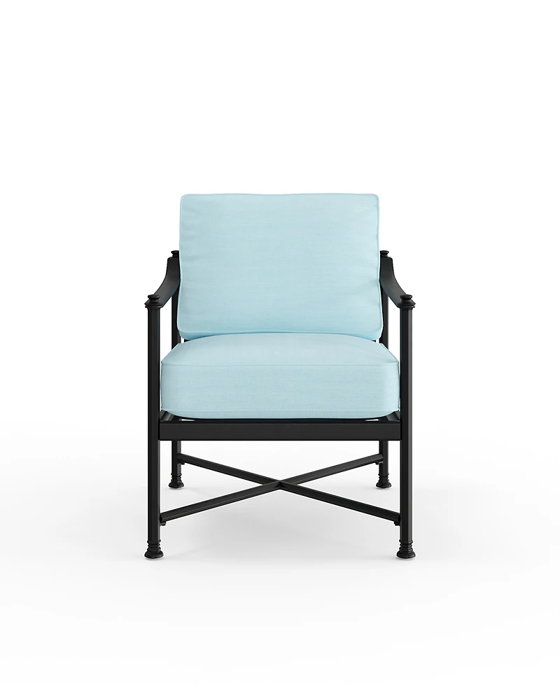 Meticulously crafted from extruded aluminum accented with refined cast details, this club chair showcases a rich, hand-applied antique finish. Its resilient electro-plated, powder-coated base coat enhances long lasting beauty, while discreet adjustable feet ensure stability and poise on any surface.