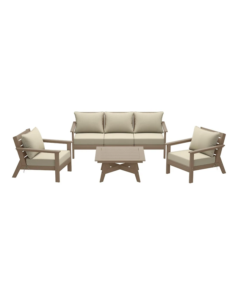 Invite friends and family over this season and gather around our charming 4 seating 5-piece outdoor patio furniture sectional set. Sink into comfort on the high-resilience foam-filled, water-repellent deep seating patio cushions, far superior to regular polyurethane foam. Crafted from durable Hdpe material, this sectional is more resilient than metal or wood options, with fade-resistant and weather-resistant properties. Create a cozy and inviting outdoor space with this stylish and durable furniture set.