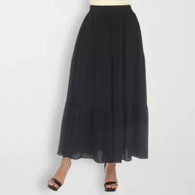 This White Mark women's maxi skirt is an elegant piece you can style for the office or a dinner date. Made from crepe, this full tiered skirt has a comfortable pull-on elastic waistband with a pleated front and side slip pockets. Wear it with a fitted tee or bodysuit and heels.