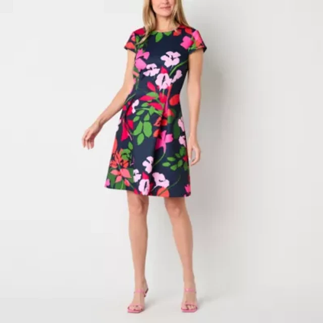 Perceptions Womens Short Sleeve Floral Fit + Flare Dress