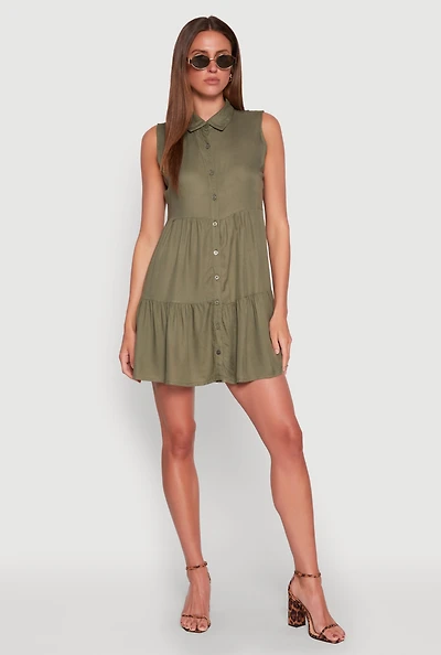 Womens Sleeveless Button Front Tiered Dress, Green, Size M