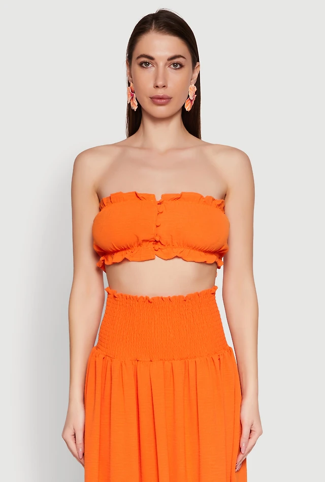 Womens Airy Ruffled Button Front Tube Top, Orange, Size L