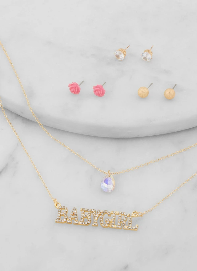 Womens Baby Girl Necklace and Stud Earrings Set, Gold