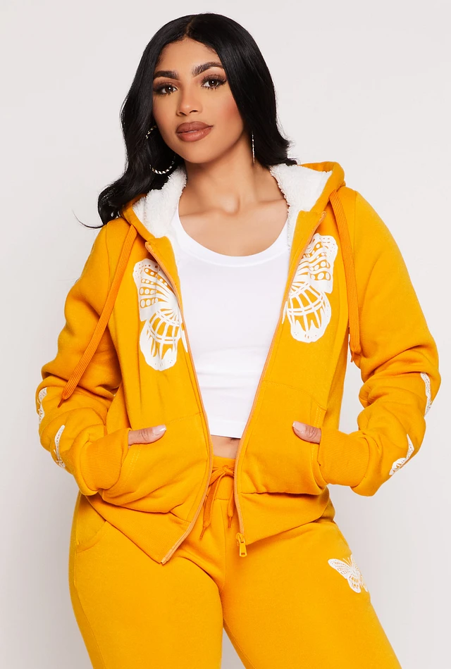 Womens Butterfly Graphic Sherpa Lined Zip Front Hoodie, Yellow, Size L