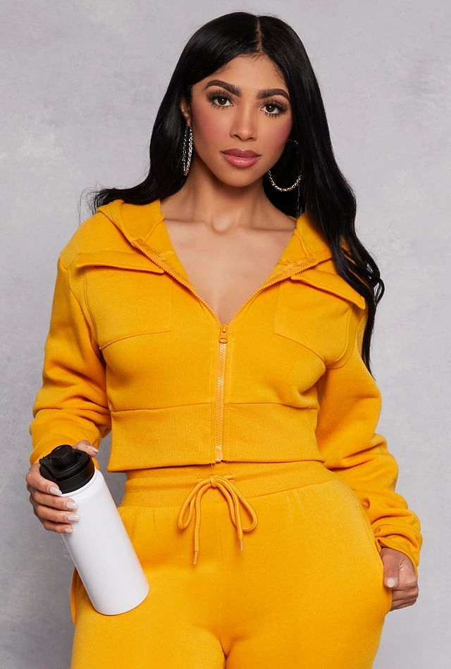 Womens Cargo Pocket Zip Front Cropped Hoodie, Yellow, Size S
