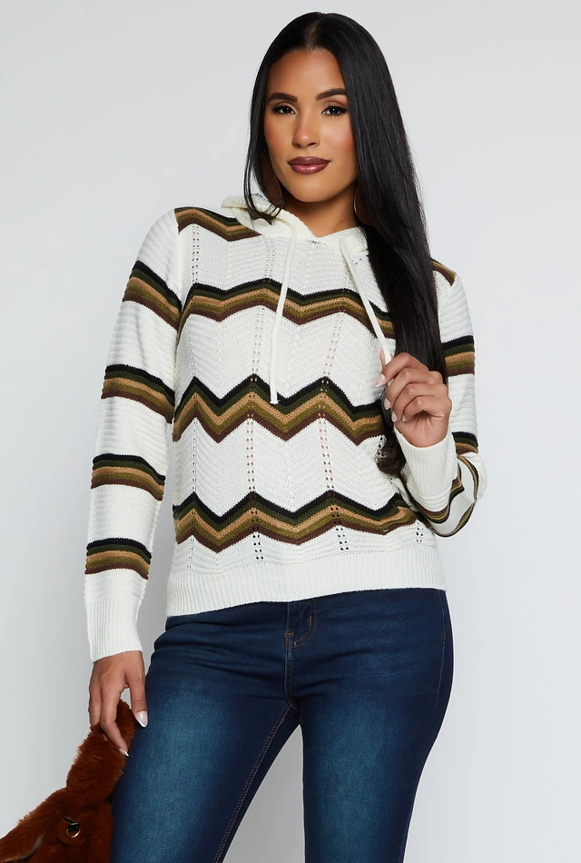 Womens Chevron Pointelle Knit Hooded Sweater, White, Size M