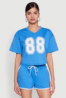 Womens 88 Graphic V Neck Crop Top, Blue, Size S