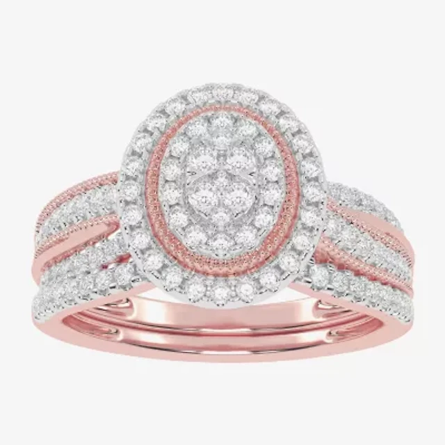 Womens 1 CT. T.W. Natural White Diamond 10K Gold Oval Side Stone Halo Bridal Set