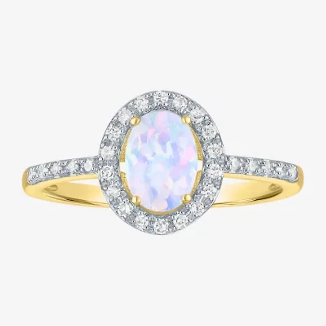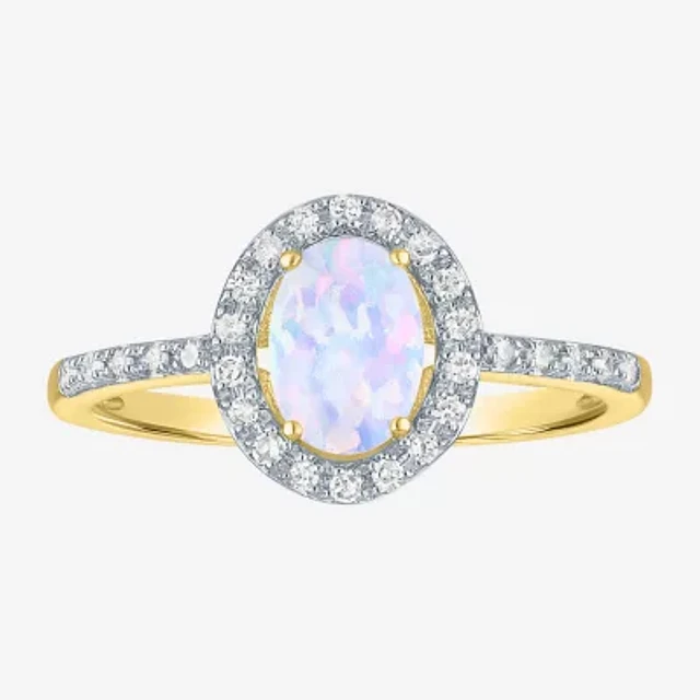 Womens Diamond Accent Lab Created White Opal 10K Gold Halo Side Stone Cocktail Ring