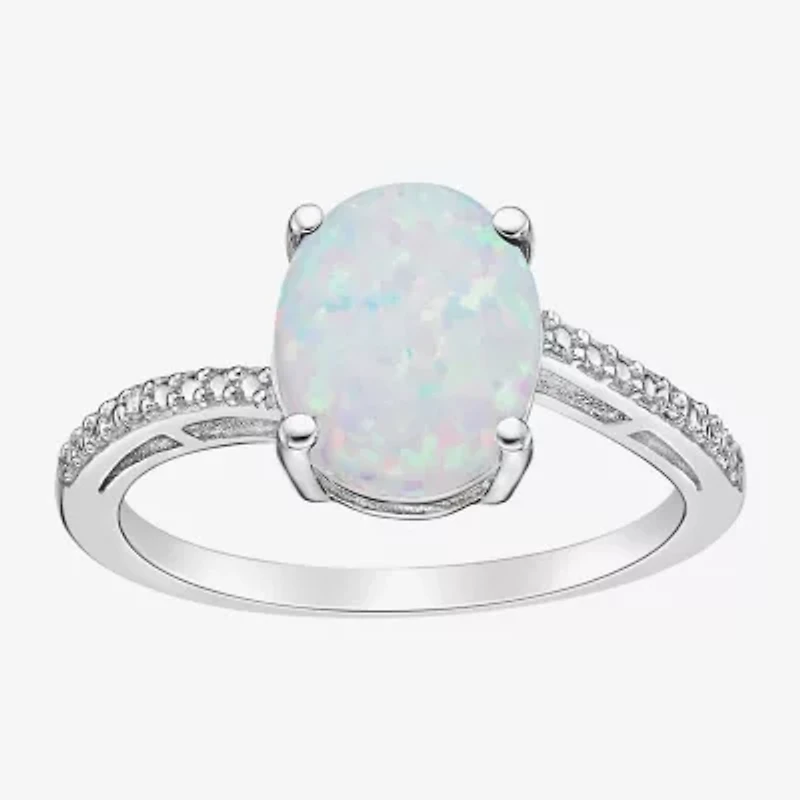 Womens Diamond Accent Lab Created White Opal Sterling Silver Oval Side Stone Cocktail Ring