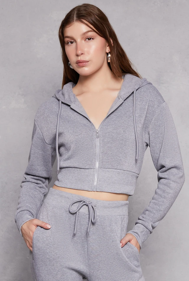 Womens Fleece Solid Cropped Zip Front Hoodie, Grey, Size M
