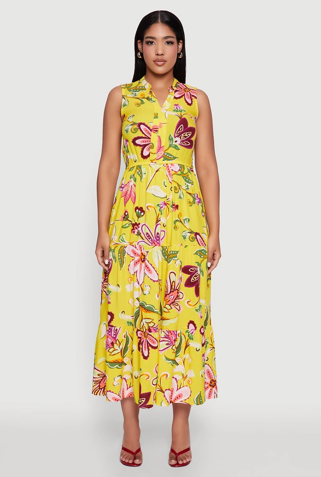 Womens Floral Print Tiered Maxi Sundress, Yellow, Size S