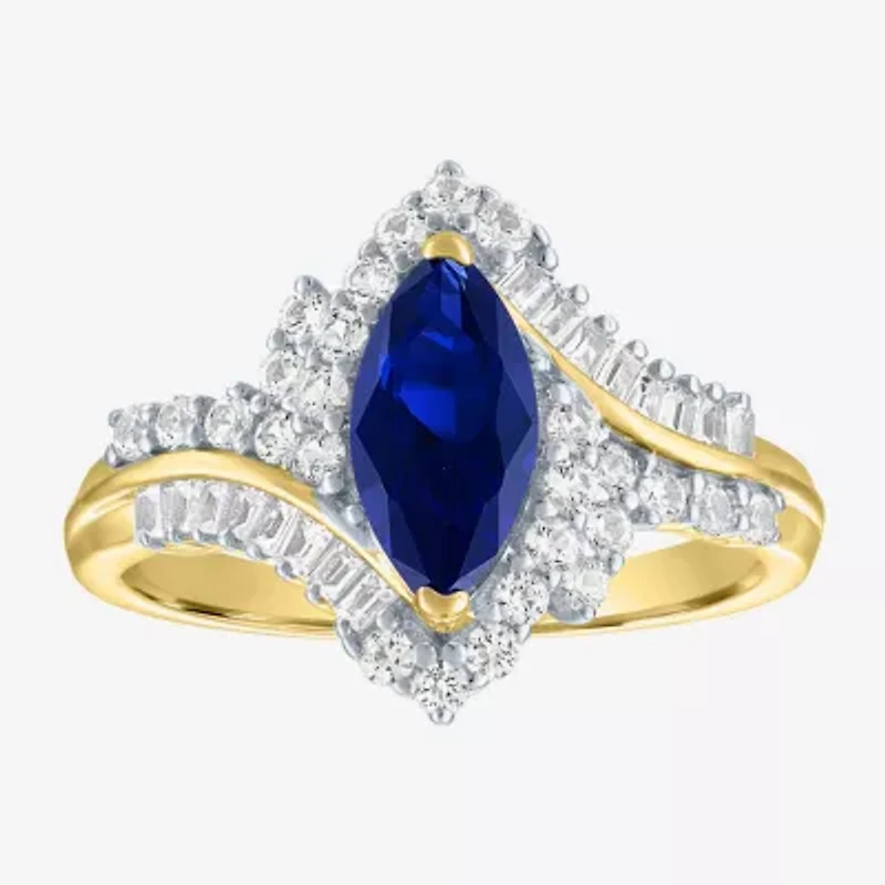 Glamorous and gorgeous, this women�s cocktail ring is a true feast for the eyes. It is made with 14K yellow gold over silver and has 1 marquise-cut genuine blue topaz and 42 Lab Grown sapphires in a prong setting. This ring will never fail to make a dazzling statement.