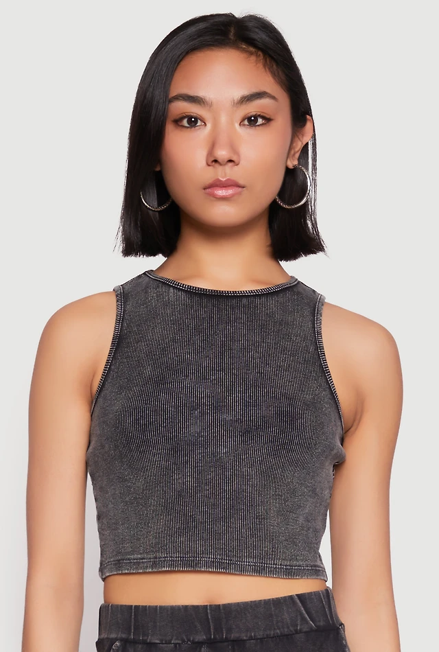 Womens Mineral Wash Ribbed Knit Crop Top, Grey, Size M